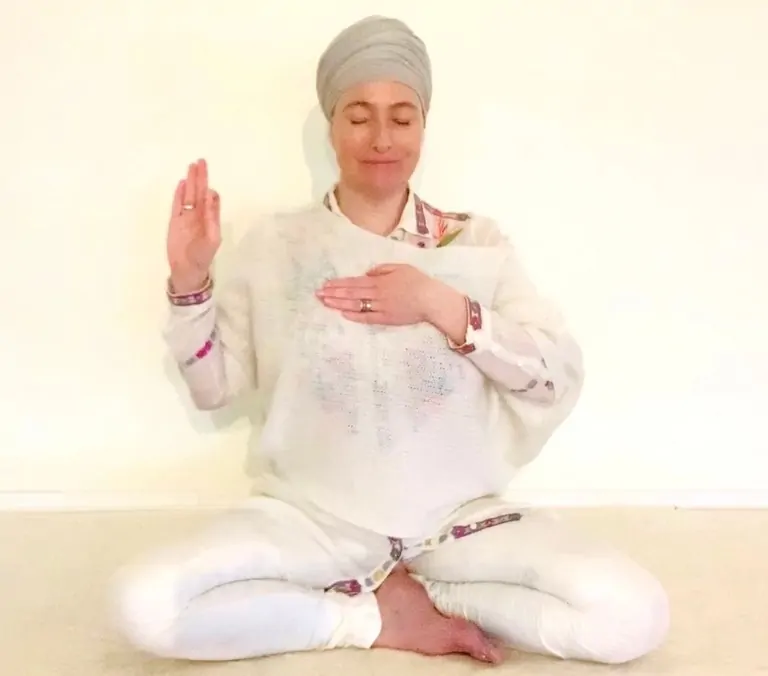 Handposition: Placera din vänsterhand mitt över bröstet. Handflatan är öppen och vilar mot bröstet oh fingrarna är parallella med golvet och pekar åt höger. Med höger hand sätter du samman tumme och pekfingertopp och lyfter handen i höjd med halsen (armbågen är böjd) och handflatan vetter framåt. Långfinger, ringfinger och lillfinger pekar rätt upp. Överarmen är avslappnad.